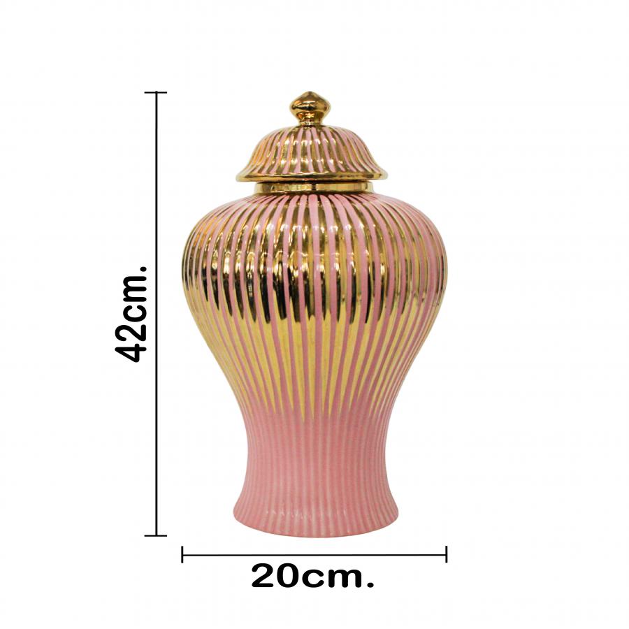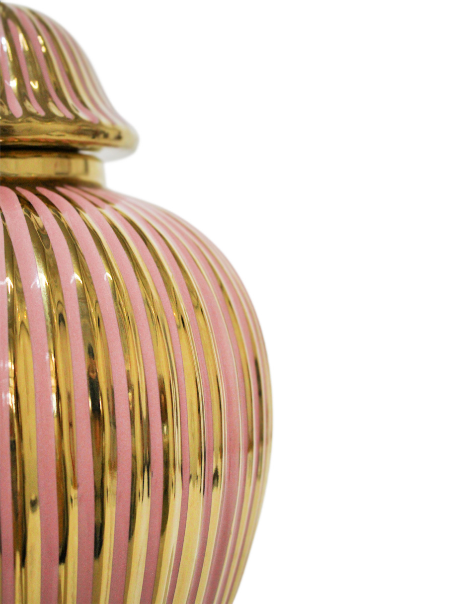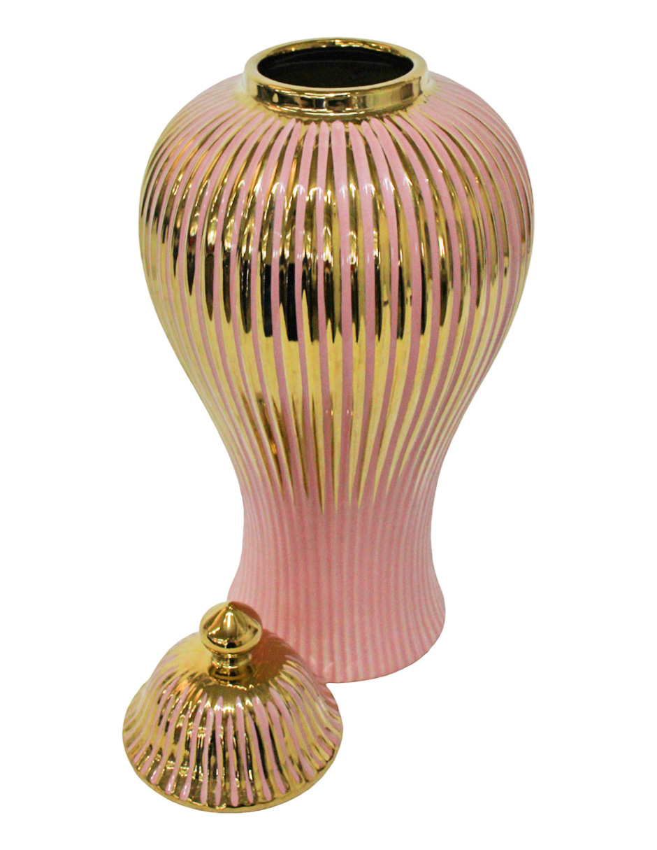 El elemento más distintivo es el efecto acanalado (o estriado) de la Cerámica, que le otorga una textura visual rica y vertical. El color Rosa le da una base vibrante y alegre, complementada por los acentos en Dorado que elevan su nivel de glamour. El cuerpo de cerámica de alta calidad le confiere peso y una sensación de lujo duradero. Este Tibor Rosa Acanalado Dorado es perfecto para decoración de piso o consolas altas.