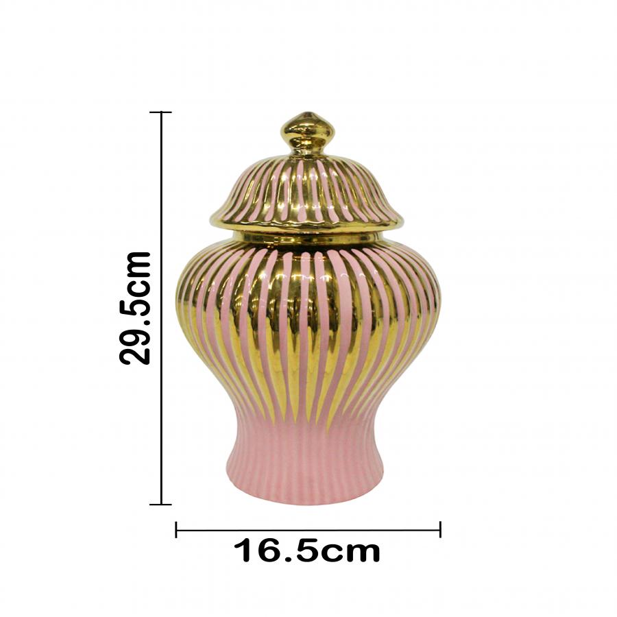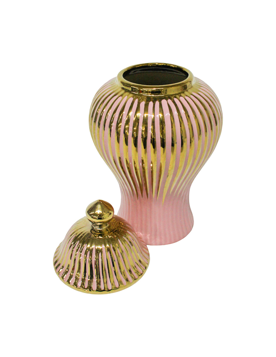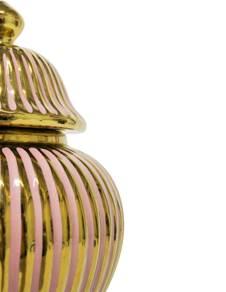 El elemento más distintivo es el efecto acanalado (o estriado) de la Cerámica, que le otorga una textura visual rica y vertical. El color Rosa le da una base vibrante y alegre, complementada por los acentos en Dorado que elevan su nivel de glamour. El cuerpo de cerámica de alta calidad le confiere peso y una sensación de lujo duradero. Este Tibor Rosa Acanalado Dorado es ideal para adornar cómodas, mesas auxiliares o como parte de un conjunto decorativo.