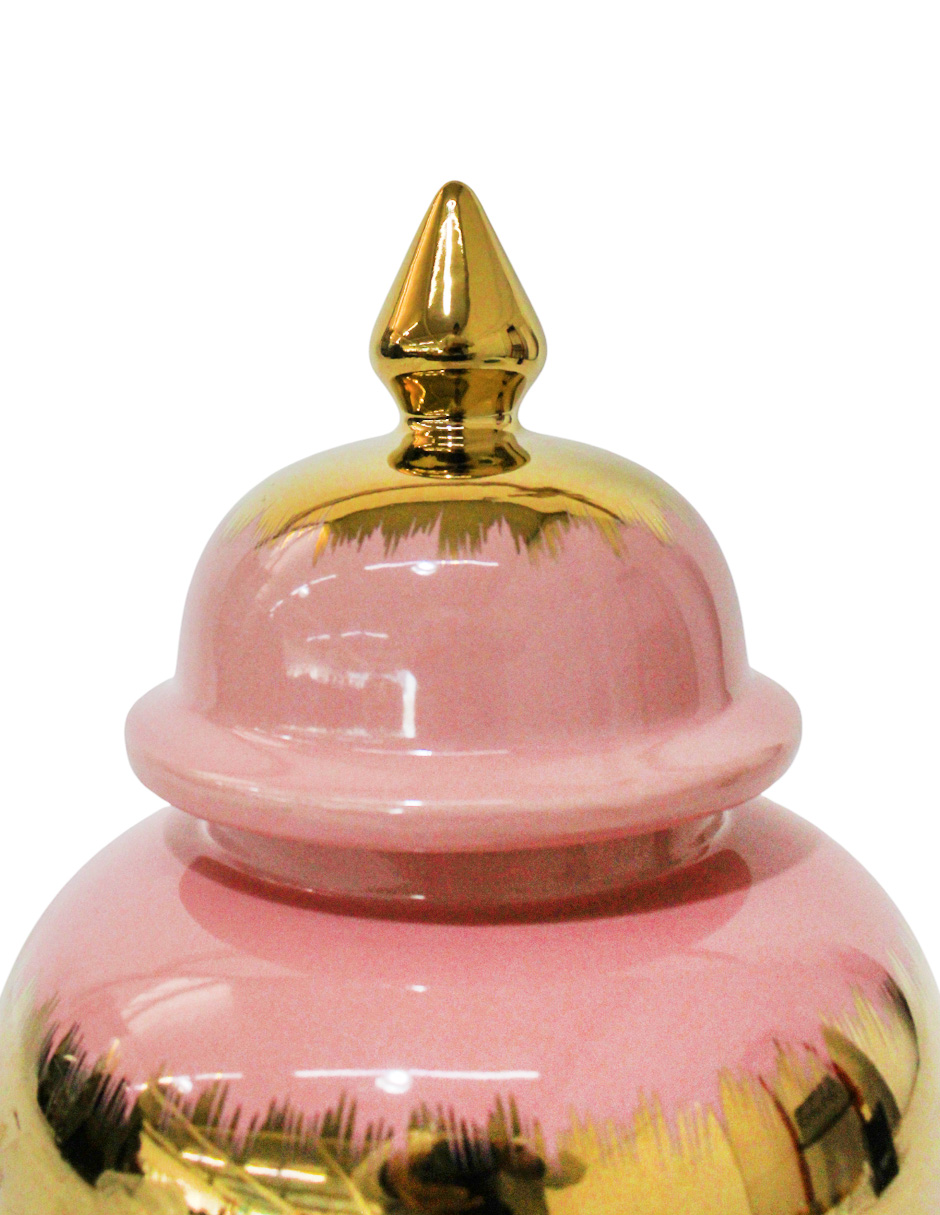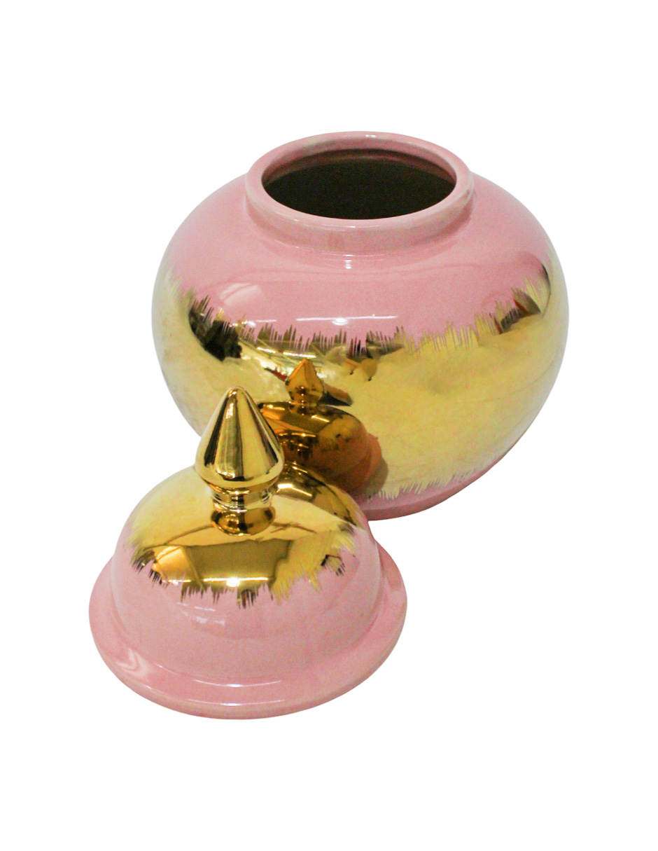 El elemento más distintivo es el efecto jaspeado de la Cerámica, que le otorga una textura visual rica y artesanal. El color Rosa le da una base vibrante y alegre, complementada por los acentos en Dorado que elevan su nivel de glamour. El cuerpo de cerámica de alta calidad le confiere peso y una sensación de lujo duradero. Este Tibor Rosa Glam Jaspeado es perfecto para mesas de centro, estanterías o repisas estrechas.