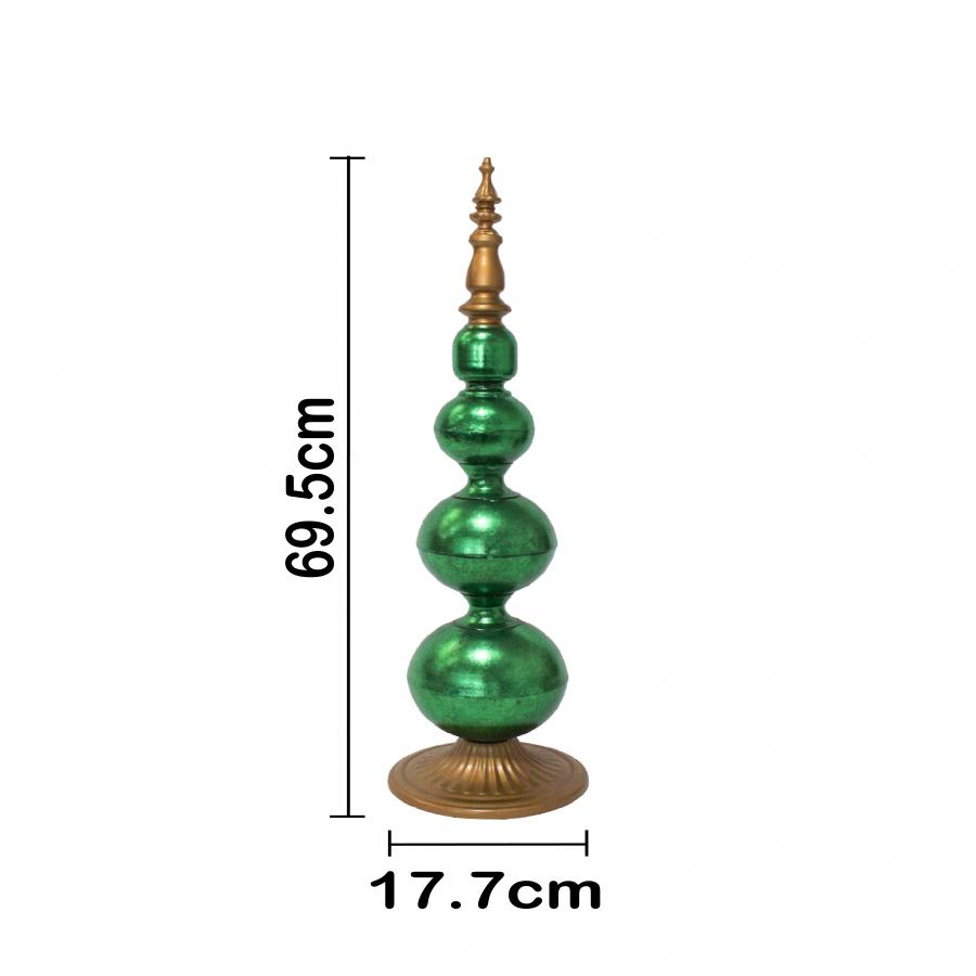 Decoración de metal en un festivo color verde con un original diseño de esferas apiladas y una base con punta dorada. Esta pieza es ideal para quienes buscan una decoración moderna y llena de estilo. Su diseño único evoca una sensación de diversión y opulencia, perfecta para crear un ambiente lleno de brillo y magia. Material: metal. Medidas: 17x17x68.5cm.