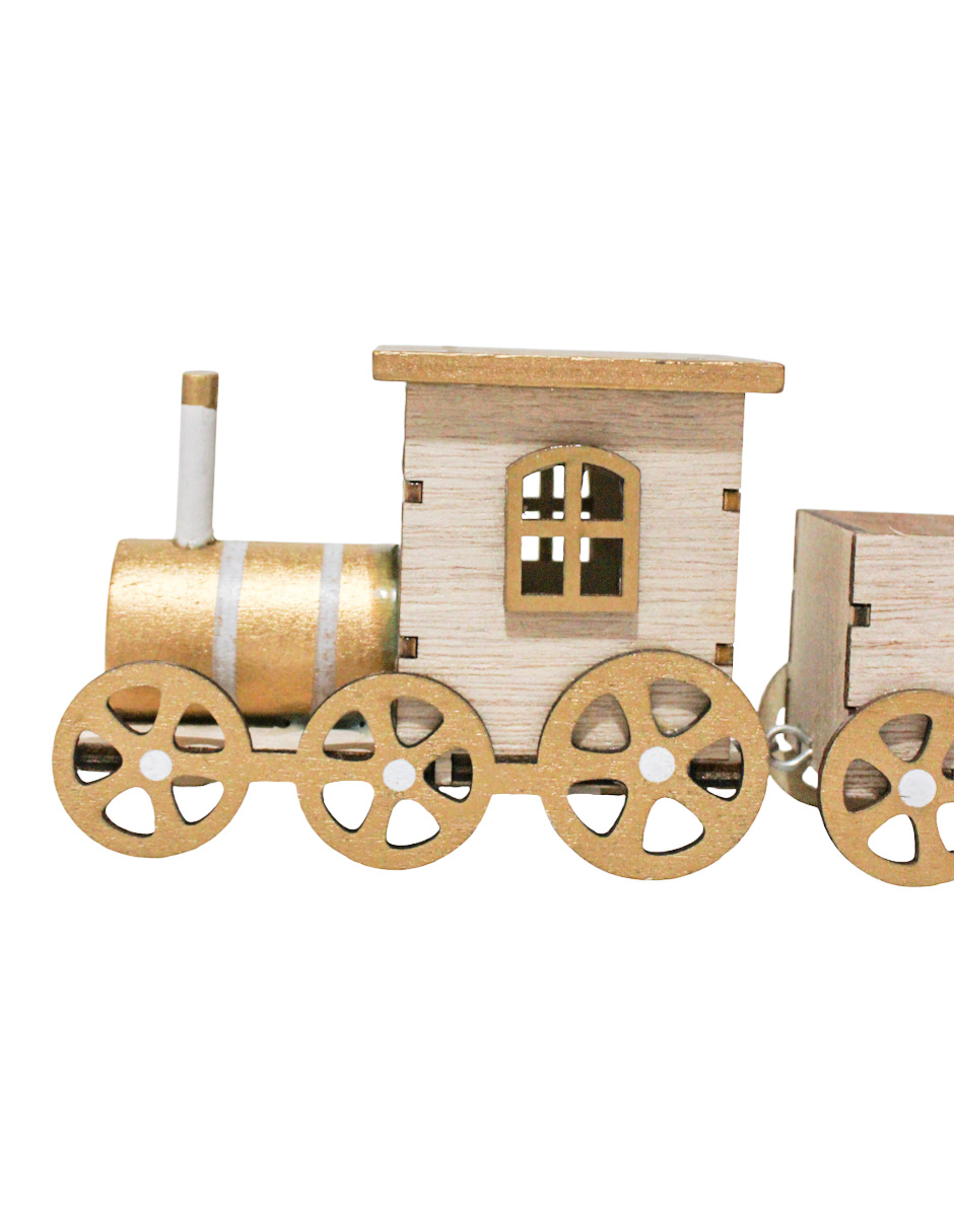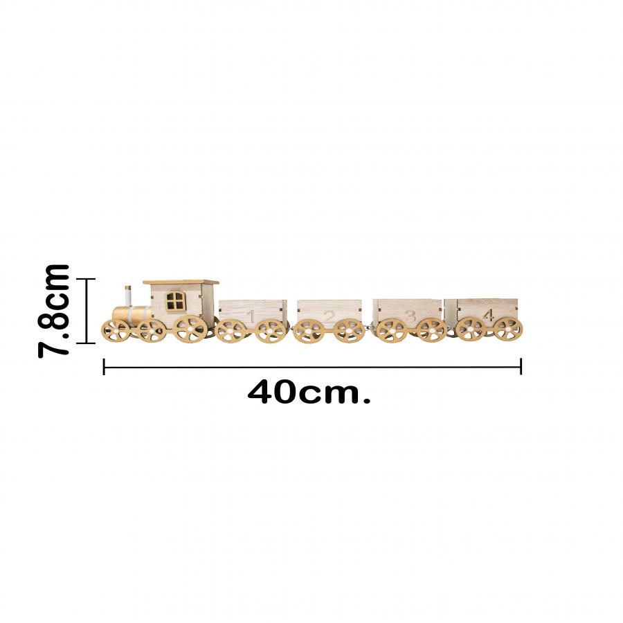 Un festivo tren de madera con 4 vagones enumerados y ruedas doradas, con medidas de 40×5.5×7.5 cm. Ideal para añadir un toque de tradición y alegría.