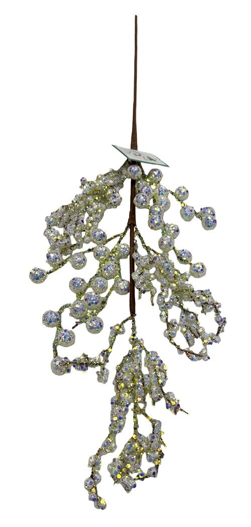 Dale un toque de elegancia helada y un brillo invernal a tu decoración con esta encantadora vara de bayas. Su diseño de pequeños frutos cubiertos de glitter en un inmaculado tono blanco añade una chispa de luz y un aire sofisticado, ideal para floreros, árboles de Navidad o acentos festivos. Es el toque perfecto para infundir calma, distinción y un ambiente suntuoso. Material: Plástico con Glitter. Medidas: 20 x 70 x 0.1 cm.