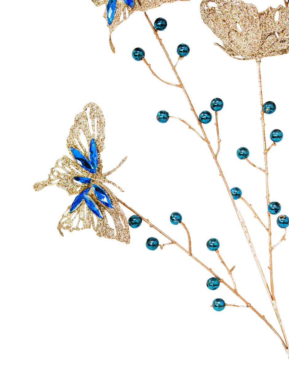 Una original vara con mariposas diamantadas doradas y pedrería azul. Es ideal para dar un toque de fantasía y color a tus arreglos florales, llenando cualquier espacio de un estilo único y mágico. Material: plástico. Medidas: 88 cm.