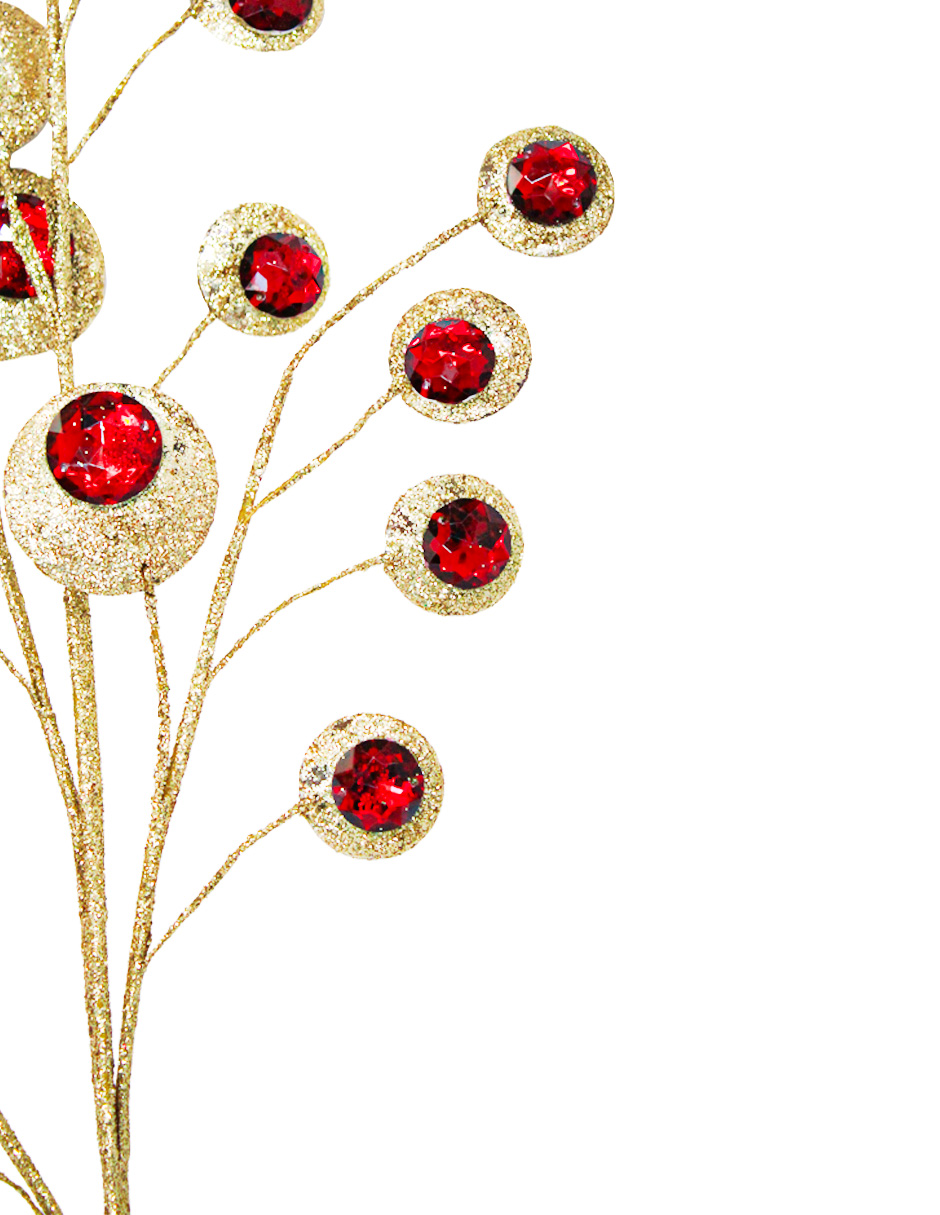 Una lujosa vara dorada diamantada con pedrería roja. Es ideal para dar un toque de brillo y sofisticación a tus arreglos florales y decoraciones, llenando cualquier espacio de un estilo único y festivo. Material: plástico. Medidas: 81 cm.