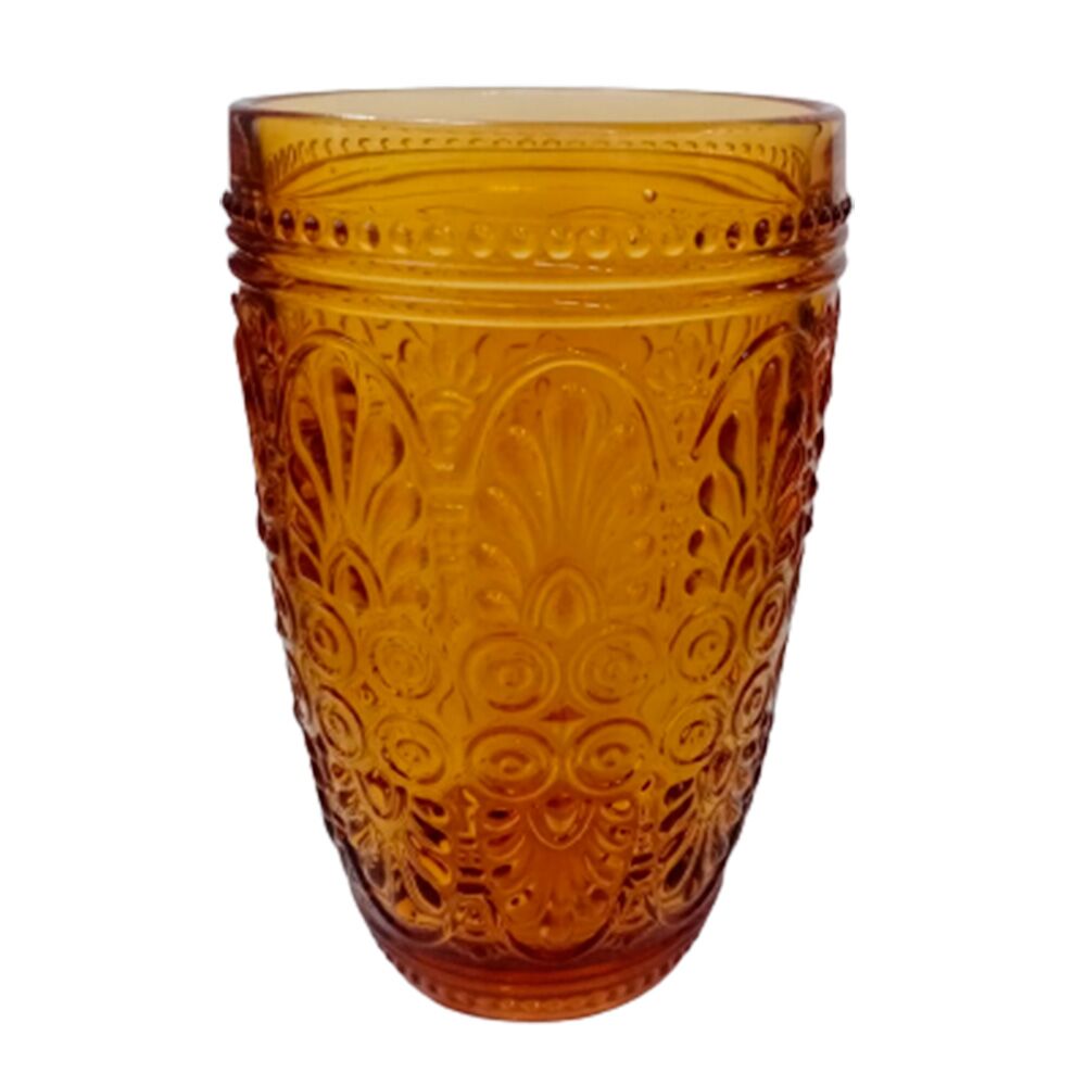 El Vaso de Vidrio Ámbar Labrado con Relieve es la pieza maestra para quien busca una estética vintage refinada, la calidez de los tonos ocres y una presencia visual imponente en su cristalería de uso diario o eventos especiales. Este objeto ofrece una sofisticación artesanal incomparable para servir bebidas refrescantes, coctelería clásica o como un acento de color en tu espacio de convivencia. Su sola presencia ayuda a elevar la armonía visual de tu mesa de manera inmediata. Lo logra mediante su diseño detallado de silueta cilíndrica robusta, enriquecida con un intrincado labrado de relieves que presentan motivos florales, arcos y puntos, lo que evoca la nobleza del diseño europeo antiguo en la categoría de Liquidación.