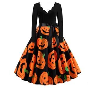 Elegante vestido de manga larga en talla grande (L) con un corte de falda amplia y cuello en V festoneado. Confeccionado en tela de poliéster ligera, es cómodo y cuenta con un llamativo estampado de calabazas de Halloween. Incluye una cinta negra para ajustar la cintura. Es la prenda ideal para fiestas temáticas y celebraciones de terror.